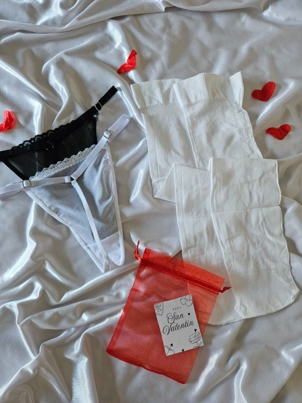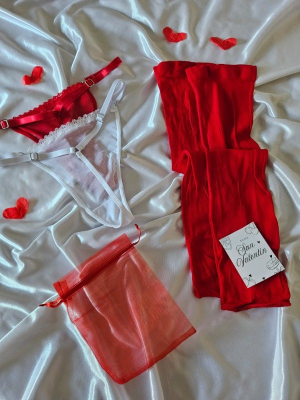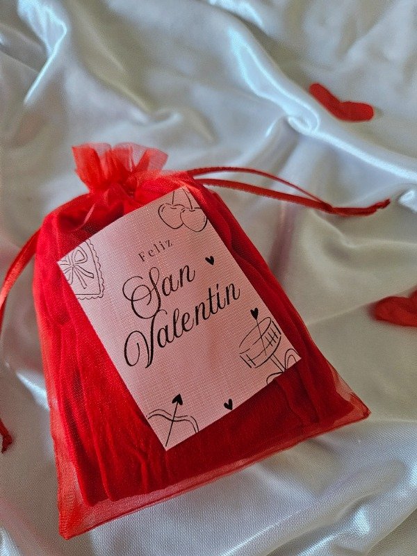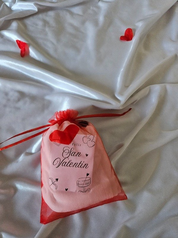 El set viene presentado en una bolsita de tul roja, con tarjetita “Feliz San Valentín”, lista para regalar.
