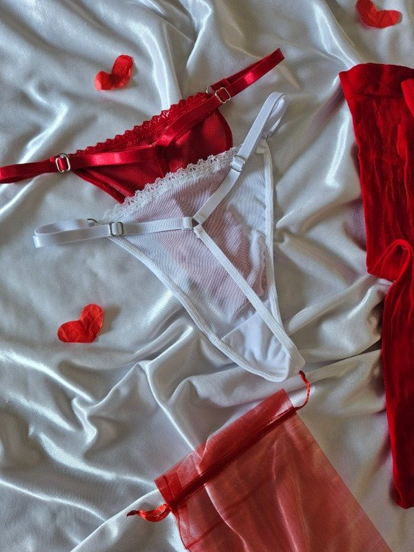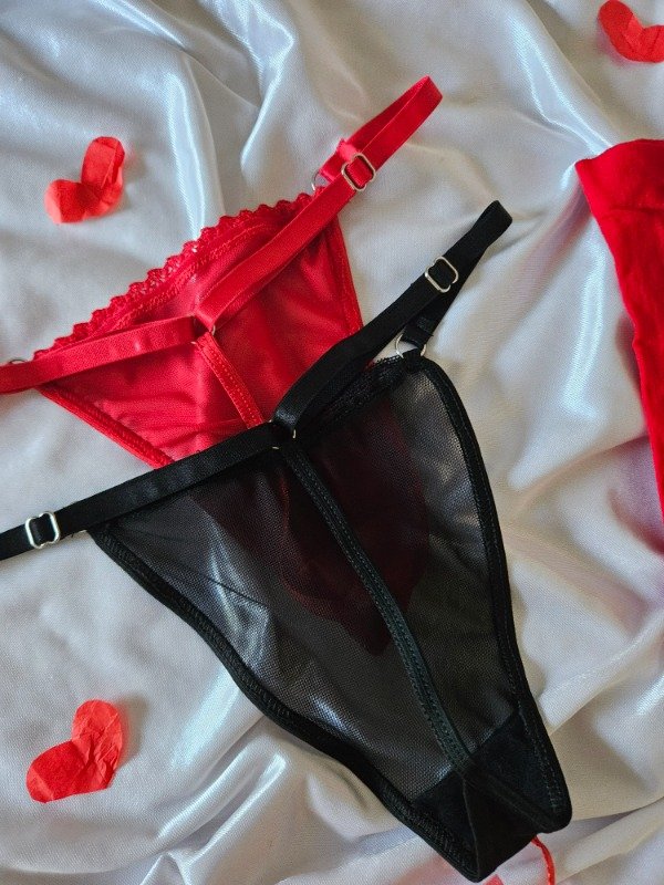 Set ideal para sorprender y jugar en San Valentín. Incluye dos tangas de tul tipo hilo, regulables, confeccionadas en tul suave y transparente que realza la silueta.