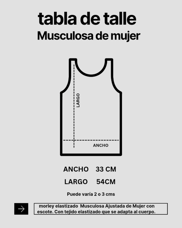 Esta musculosa de mujer está confeccionada en un tejido de morley elástico que se adapta perfectamente al contorno del cuerpo, brindando una sensación de confort y estilo. Con un escote sutil y moderno, es la prenda ideal para crear looks versátiles y elegantes. Su diseño ajustado resalta la figura, mientras que su material de alta calidad garantiza durabilidad y suavidad al tacto. Perfecta para combinar con jeans, shorts o faldas, esta musculosa es una prenda esencial en cualquier armario.